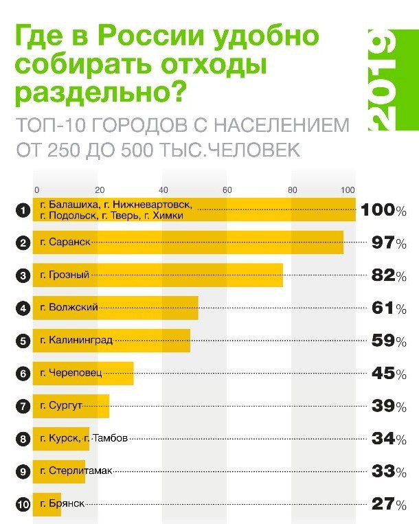 Сегодня 18% жителей России имеют доступ к инфраструктуре раздельного сбора – это в два раза больше, чем в прошлом году. Тверь заняла первое место среди городов с населением до 500 тысяч человек, где удобно разделять отходы. Это значит, что 100% населения города имеют доступ к придомовым контейнерам для полезных отходов. Также в топ рейтинга вошли Подольск, Балашиха, Химки и Нижневартовск.
